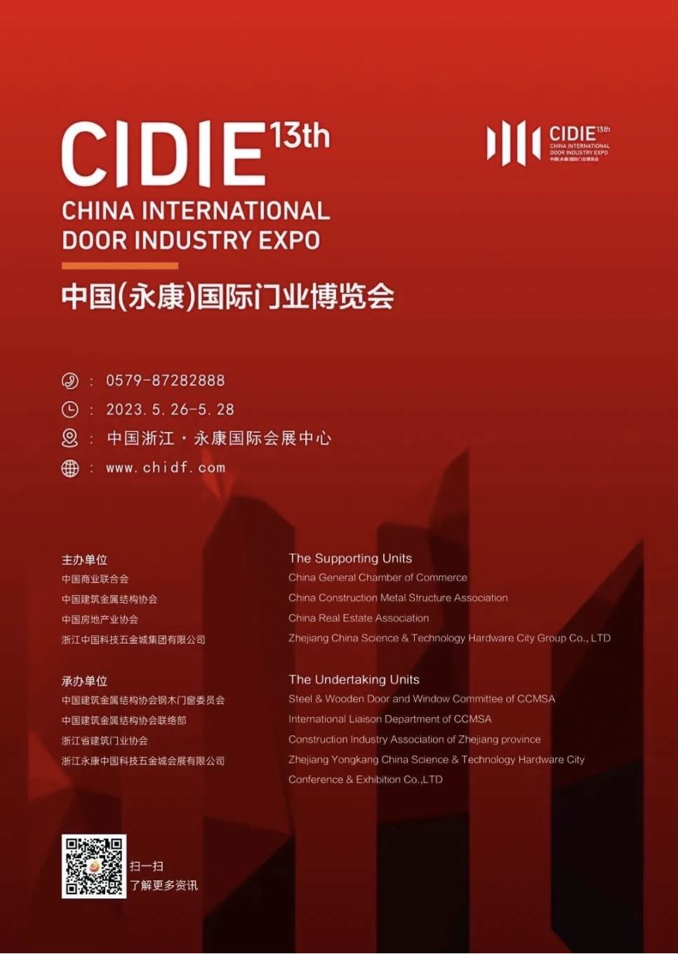 浙江永康有著“中國門都”的美譽,是中國門業(yè)行業(yè)產(chǎn)業(yè)集中度高、市場覆蓋廣、科技創(chuàng)新和品牌建設(shè)成果最多的地區(qū)。2023年5.26-5.28,第13屆中國永康國際門業(yè)博覽會將在永康國際會展中心盛大開展。