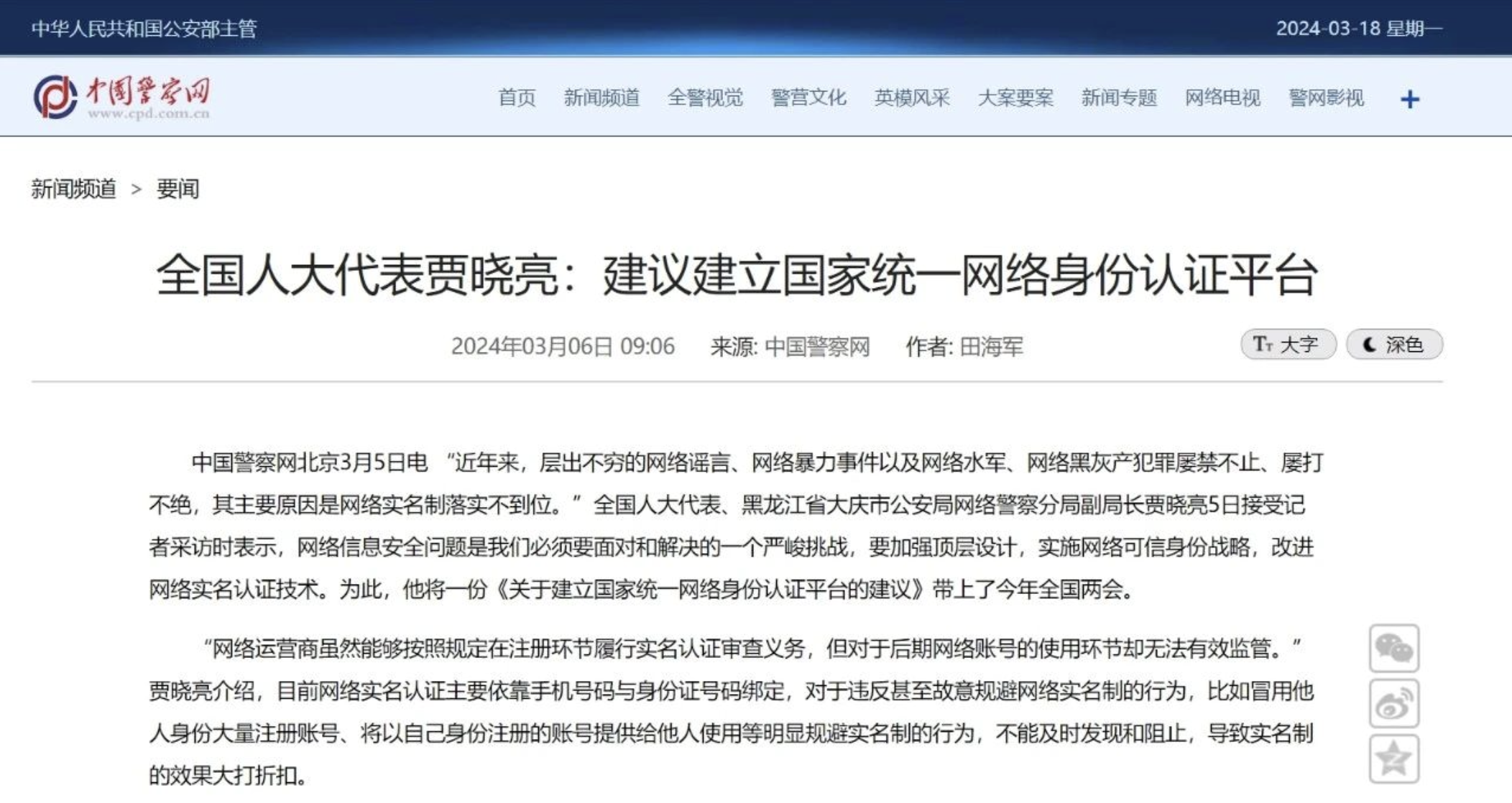 在數(shù)字化浪潮席卷全球的今天,網(wǎng)絡(luò)信息安全問(wèn)題日益凸顯,網(wǎng)絡(luò)謠言、網(wǎng)絡(luò)暴力以及網(wǎng)絡(luò)黑灰產(chǎn)犯罪等問(wèn)題層出不窮。近日,全國(guó)人大代表、黑龍江省大慶市公安局網(wǎng)絡(luò)警察分局副局長(zhǎng)賈曉亮在接受記者采訪時(shí)表示,這些問(wèn)題的根源在于網(wǎng)絡(luò)實(shí)名制落實(shí)不到位,因此加強(qiáng)頂層設(shè)計(jì),實(shí)施網(wǎng)絡(luò)可信身份戰(zhàn)略,改進(jìn)網(wǎng)絡(luò)實(shí)名認(rèn)證技術(shù)成為當(dāng)下迫切需求。