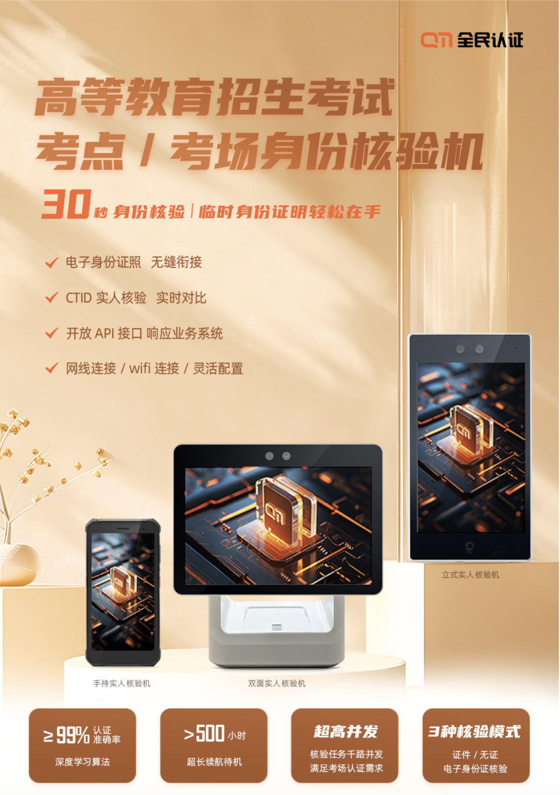 為從根源上解決替考等違規(guī)行為的發(fā)生,全民認證創(chuàng)新探索數(shù)字身份在教育考試場景的管理應用,打造“高等教育招生考試,考點、考場身份核驗解決方案”,以智能化身份識別終端設(shè)備為載體,結(jié)合大數(shù)據(jù)及生物識別技術(shù),為考生身份核驗提供更權(quán)威、更高效、更安全的手段,有效解決人工核驗不準確、工作量大、標準不統(tǒng)一、核驗工作效率低等痛點問題,嚴防冒名頂替。
