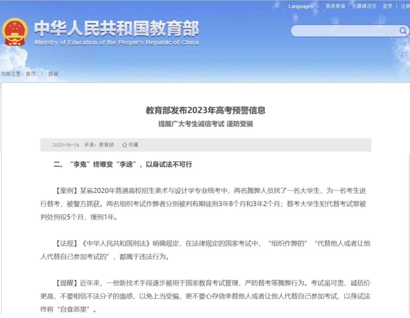 教育部發(fā)布高考預警信息