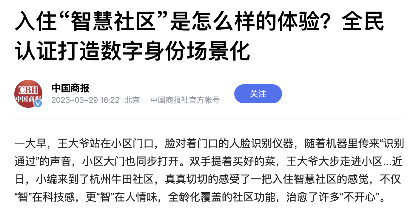 以往智慧社區(qū)使用的智能設(shè)備都通過(guò)物與物的聯(lián)接,實(shí)現(xiàn)智能化融合應(yīng)用,對(duì)于用戶來(lái)說(shuō)是看不見摸不著的。而在牛田社區(qū),全民認(rèn)證讓用戶真實(shí)感受到了智慧社區(qū)的概念,那就是用“數(shù)字身份認(rèn)證”使建筑物和建筑物之間、設(shè)備與設(shè)備之間形成了一條無(wú)形的聯(lián)接,真正實(shí)現(xiàn)了“一臉通行”的目標(biāo),從小區(qū)大門延伸到了主戶家門口,讓居民們發(fā)現(xiàn)原來(lái)虛擬空間的數(shù)字身份可以在現(xiàn)實(shí)社會(huì)得到運(yùn)用,智慧社區(qū)的智能化運(yùn)用也有了更好的使用體驗(yàn)。
