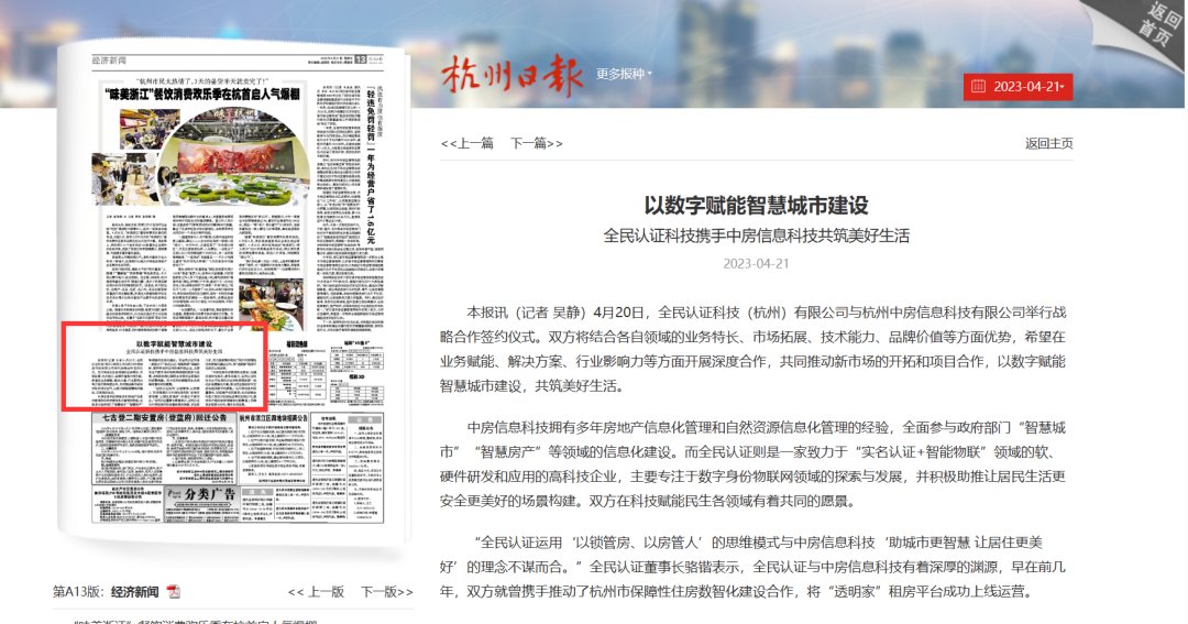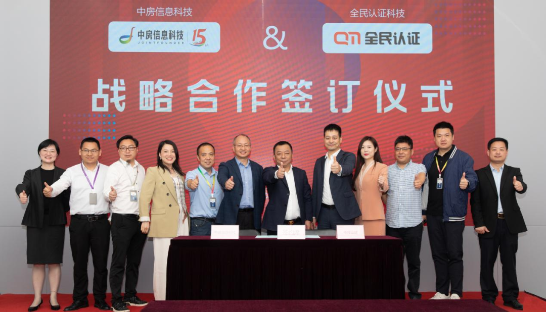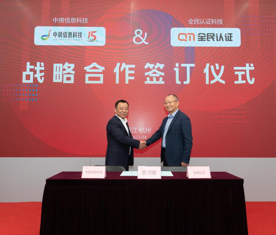 2023年4月20日,全民認(rèn)證科技(杭州)有限公司(以下簡稱“全民認(rèn)證”)與杭州中房信息科技有限公司(以下簡稱“中房信息科技”)在中房信息科技總部舉行戰(zhàn)略合作簽約儀式。中房信息科技IT事業(yè)群總裁謝運(yùn)濤與全民認(rèn)證聯(lián)合總裁郭衛(wèi)文共同簽署了戰(zhàn)略合作書,中房信息科技黨總支書記、董事長、總經(jīng)理嚴(yán)志民與全民認(rèn)證董事長駱鍇共同出席見證。