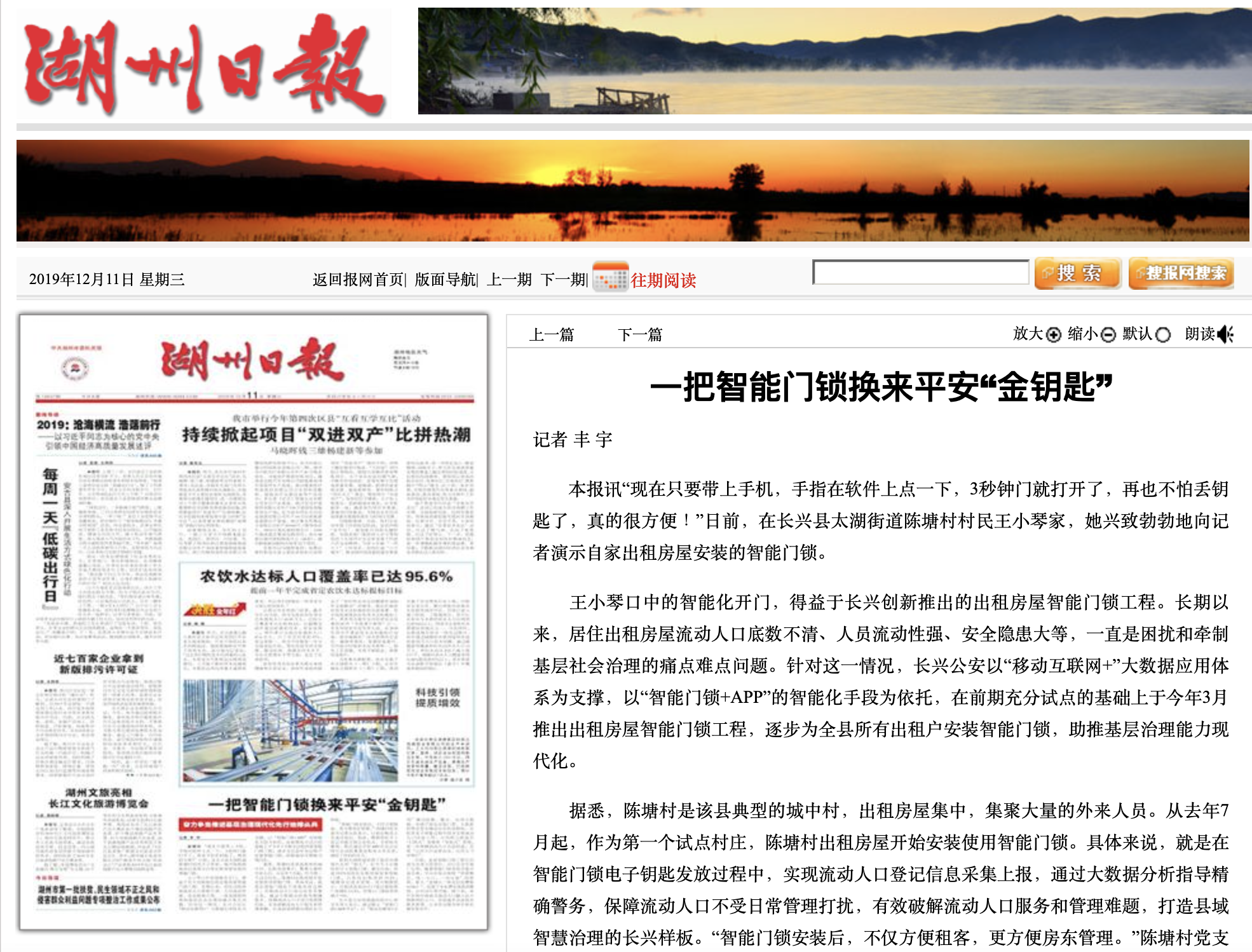 12月11日湖州日報頭版發(fā)文《一把智能門鎖換來平安“金鑰匙”》,報道長興縣出租房屋智能門鎖工程的顯著成果,在全民認(rèn)證科技(杭州)有限公司的大力配合下,該縣智能門鎖工程已經(jīng)成為全省示范項目,并已在全市推廣應(yīng)用。