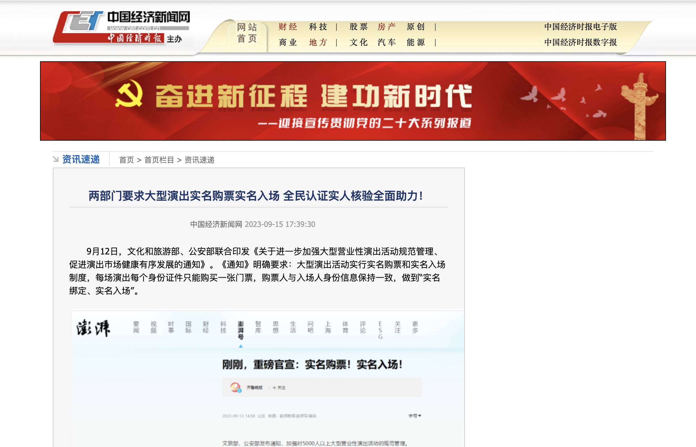 9月12日,文化和旅游部、公安部聯(lián)合印發(fā)《關(guān)于進(jìn)一步加強(qiáng)大型營(yíng)業(yè)性演出活動(dòng)規(guī)范管理、促進(jìn)演出市場(chǎng)健康有序發(fā)展的通知》?!锻ㄖ访鞔_要求:大型演出活動(dòng)實(shí)行實(shí)名購(gòu)票和實(shí)名入場(chǎng)制度,每場(chǎng)演出每個(gè)身份證件只能購(gòu)買一張門票,購(gòu)票人與入場(chǎng)人身份信息保持一致,做到“實(shí)名綁定、實(shí)名入場(chǎng)”。